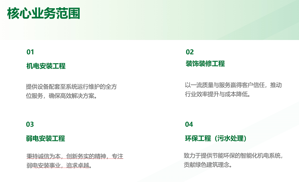 公司自创立以来,坚持走可持续发展之路,积极在建筑行业中推行一体化、工厂化、节能化。经过几年的积累,公司在机电安装、电子与智能化、装修装饰、污水工程、实验室设备系统等方面拥有完善的技术和实践能力,并对整体机电系统进行系统性规划设计,且拥有设备配套、工程施工、系统运行和工程维护保修等“一站式”产品服务。